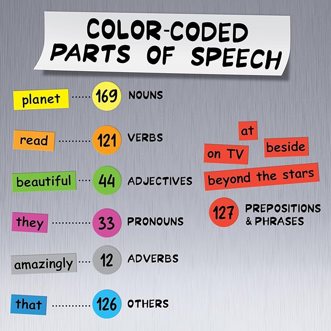 - Huge Variety – Contains 632 pieces. These refrigerator magnets for kids are .75” tall and have a kid-friendly font. Contains 12 adverbs, 44 adjectives, 169 nouns (for stories and fun sentences!), 121 verbs, 127 prepositions and phrases, 33 pronouns, and 126 other words. Trust us when we say there’s enough variety to have a fun time! There are duplicates of frequently used words like ‘a, the, he, she, and I’ so kids can make multiple sentences at a time.