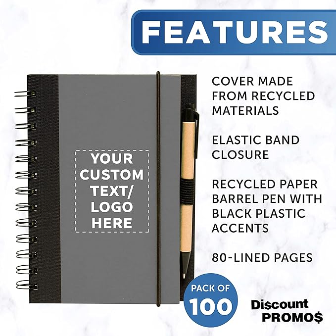 DISCOUNT PROMOS Custom Eco Block Notebooks with Pens Set of 100, Personalized Bulk Pack - Perfect for School, Office, Business, Home - Smoke