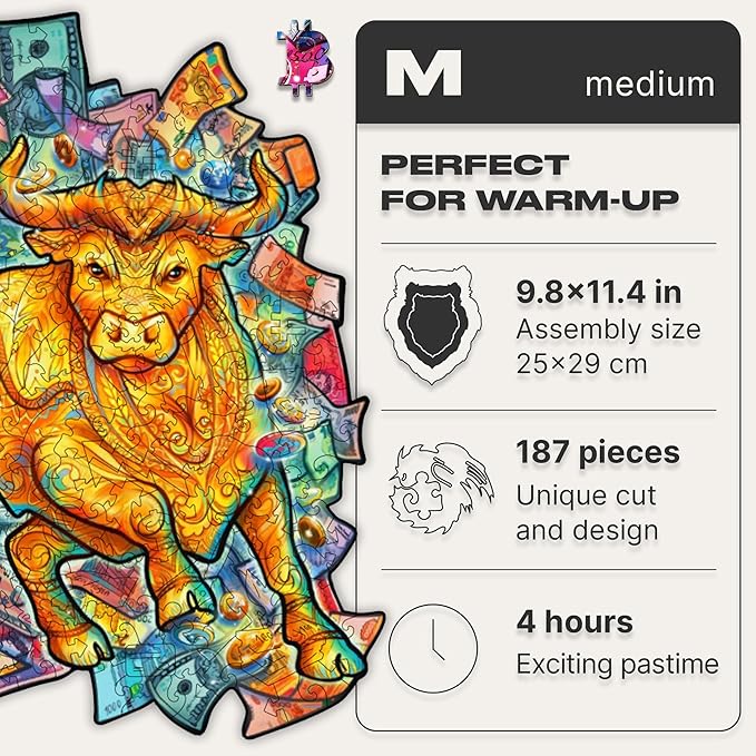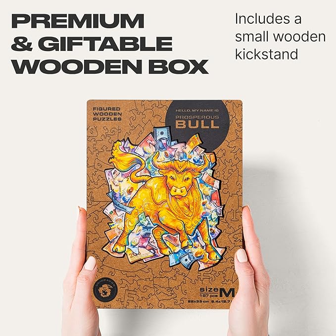 UNIDRAGON Original Wooden Jigsaw Puzzles - Prosperous Bull, 102 pcs, Small 7.5"x8.7", Beautiful Gift Package, Unique Shape Best Gift for Adults and Kids