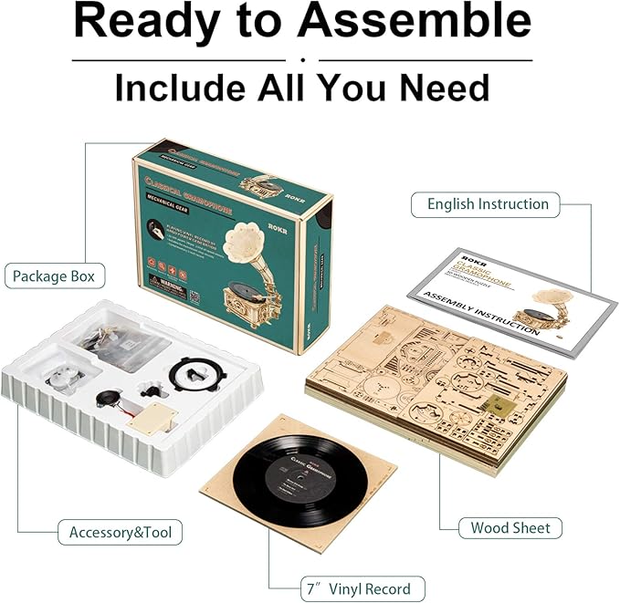 - 【Everything You Need 】The building model kit includes clear instruction, pre-cut wood sheets, every accessory, a 7" vinyl, wax, sandpaper. No glue or battery required. The premium package will be a unique gift on any occasion like birthday, holiday,or business meetings.