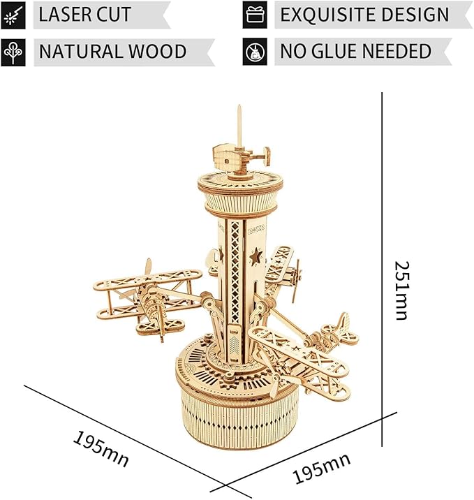 - 【Enchanting Mechanical Display & Melody】Watch the charming wooden airplane orbit around the control tower, gracefully bobbing up and down in sync with a classic melody. This mesmerizing motion, driven by precise mechanical gears, creates a captivating visual and auditory spectacle for your space.