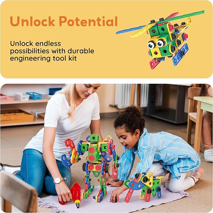 - POWER DRILL AND TOOL KIT INCLUDED: Comes with a kids safe battery powered drill, clickable ratchet, wrench, bolts, and wheels for hands on learning and interactive building. Kids can assemble 2D or 3D structures and transform ideas into real creations. Encourages fine motor skill development and sparks imaginative thinking. Batteries not included for drill. Safe for children age 3 and up.