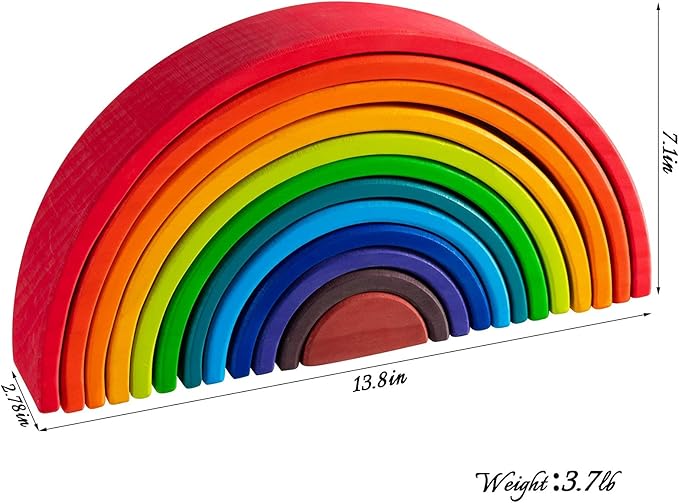 - ๐Extra Large Size - Large wooden rainbow stacker 12 pieces nesting together measure 13.8" length x 2.78" width x 7.1 high. Package weight: 3.78 LB. Applicable age: 36 Months +