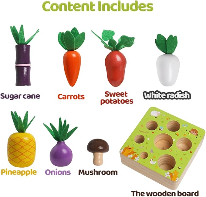 - Color Shape Sorting Toys:The fun color shape sorting wooden Toys that doubles as engaging montessori toys and a versatile learning toy.Featuring colorful vegetable and fruit pieces,it helps toddlers recognize sizes, shapes, and colors while fostering critical problem-solving skills.