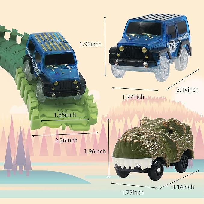 - Dinosaur Road Race for Kids 3-5,6 Years Old - Dinosaur themed road race track includes 216 dino tracks, 1 race car, 1 dinosaur figure of the car and Tunnel, 8 dinosaurs, 1 bridge, 2 slopes, 3 trees, 2 Y-type junction and 1 door. Much enough to create A long Dinosaur World Race track!