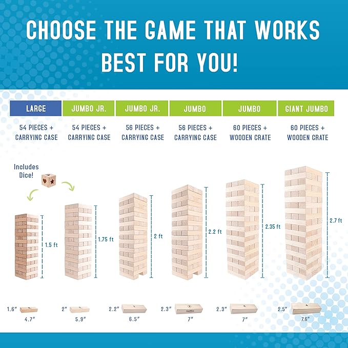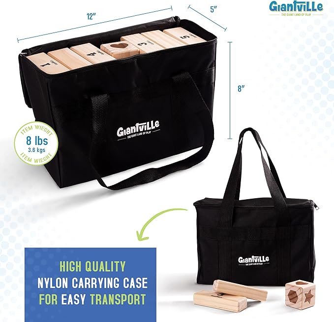 Giantville Giant Tumbling Timber Toy - Premium Pine Wood Life-Size Blocks Tower - Big Floor/Board Indoor/Outdoor Yard Game for Kids & Adults - 54-Pieces + Dice + Carry Bag - Grows to Almost 3-Feet