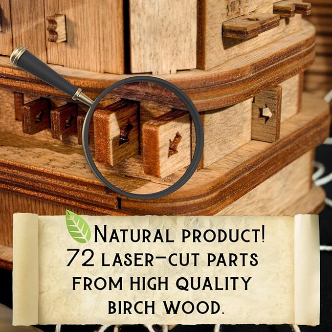 - โป๏ธ REUSABLE BRAIN GAMES โOur Escape Room in a box offers you 60-90 minutes of immersive gameplay. After you have solved our treasure box, you can simply reassemble the Cluebox and let other players solve it. The Cluebox is not just a game, but also a stylish home accessory made from the finest laser-cut birch wood. With its appealing wooden design, this 3D puzzle for adults and teens is an instant eye-catcher and a great gift idea. The size of the wooden puzzle box: 4.3 x 4.3 x 4.7 in