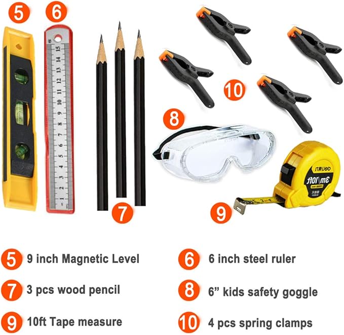 - ๐ธใ25-Pcs Children's Real Repair Toolsใ: This educational real tool kit for Starter includes: stubby claw hammer,needle nose pliers,adjustable wrench,10ft tape measure,kids safety glasses & protection bag,magnetic flat & phillip screwdrivers,steel ruler,magnetic level,tool belt bag (Waist 20"-40")etc. All are high quality for the entry level kids