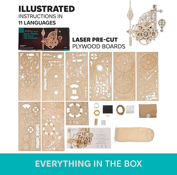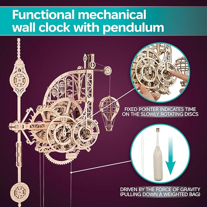 - Working Mechanism: Gravity-powered system in our 3D puzzle for adults with a descending weight bag that turns the gears, moving the pendulum and rotating the hour and minute discs.