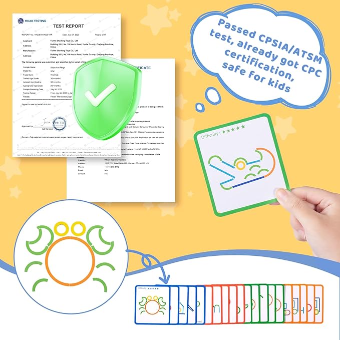 - ๐งฉ Creative Sticks And Rings --- Our activity toy includes: 120pcs sticks & rings, 20pcs double-sided cards, 1pcs wooden base, 1pcs storage bag. Building and creating letters or patterns with colorful sticks and rings(such as animals vehicles and more). Kids can trying to figure out what pieces make the designs on the card, Also, we encourage our kids create their own design. This set is a great ideal for parents who prioritize safety and mindful play.