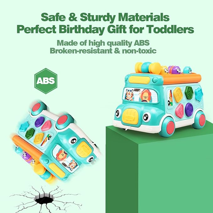 - Multifunction: The music baby bus features five sides of fun activities, including shape sorters, gear linkage, whack-a-mole game, animal matching, steering wheel, push & pull and toy clock