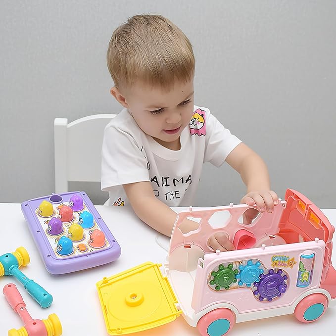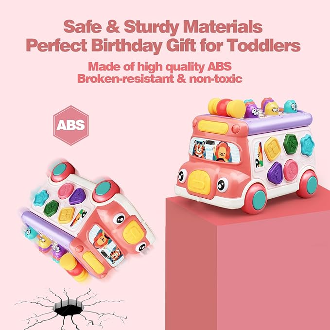 - Multifunction: The music baby bus features five sides of fun activities, including shape sorters, gear linkage, whack-a-mole game, animal matching, steering wheel, push & pull and toy clock