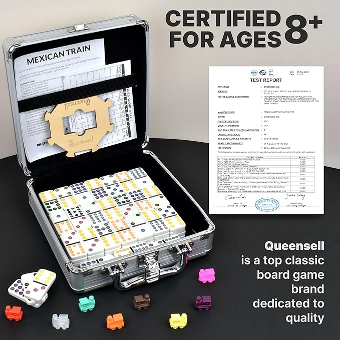 Queensell Mexican Train Dominoes Set with Wooden Hub, Domino Tile Board Games - Double 12 Dominos Set for Family Game Night for Adults and Kids Ages 8 and up (Double 12)