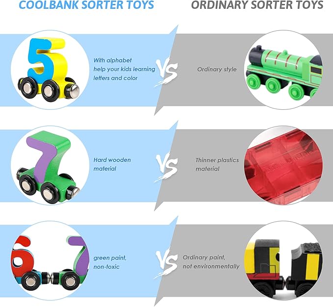 - Stronger Magnet: The magnets on our wooden trains were carefully chosen and have been tested extensively to be stronger than those in other sets. This means more train cars can be connected together to make longer trains. 27 pcs wooden train set compatible with other track toys.