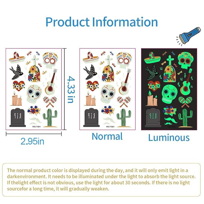 - Glow in the dark. After absorbing sunlight during the day, this tattoo will glow in the dark. The luminous time will be affected by light and temperature. If the luminous effect becomes weak or even no luminescence, just absorb the sunlight again and it will shine again.