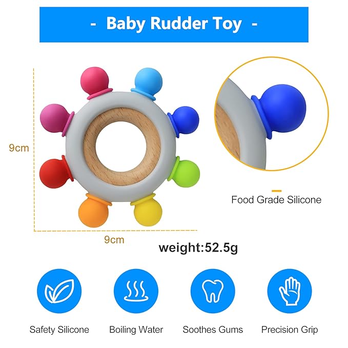 - ★ SAFE MATERIAL – 100% food grade silicone and natural beech. The size of this silicone rudder teether is designed to be just the right size to prevent babies from swallowing.