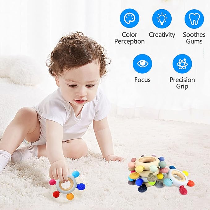 - ★ SENSORY TOYS – This silicone teether is available in 3 Morandi colors, which can improve your baby's sensory abilities. The surface of the silicone rudder is concave and convex, which enhances the function of soothing the baby's gums. The soft and flexible material decreases risk of mouth injury.
