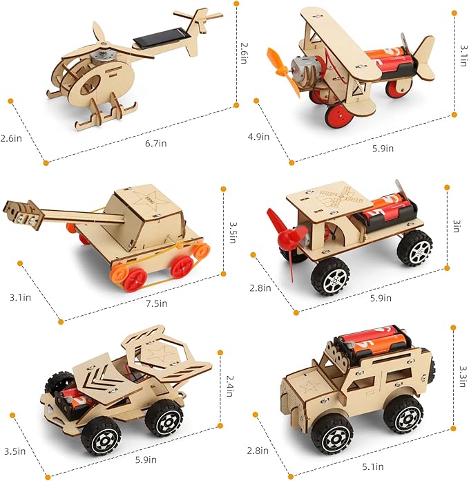 - CAR MODEL KITS: Contain Four-wheel Drive, Tank, Wind-powered Vehicle, Off-road Vehicle, Solar Helicopter and Biplane(We also included a screwdriver.). Total 6 pack of building toys for boys age 8-12. Also a very interactive activity for all(Battery Not Included)