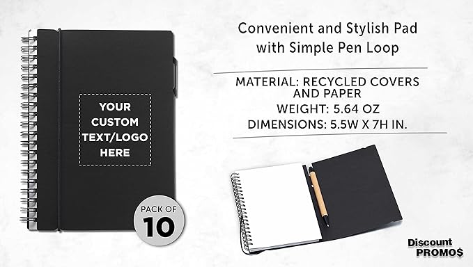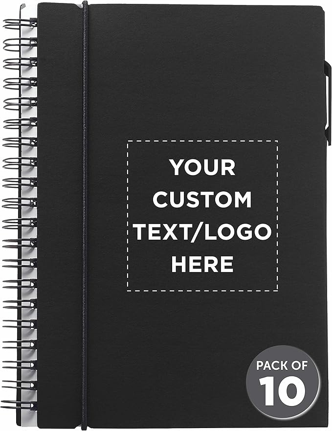 DISCOUNT PROMOS Custom Spiral Notebooks with Elastic Closure Set of 10, Personalized Bulk Pack - Perfect for School, Office, Business and More - Black