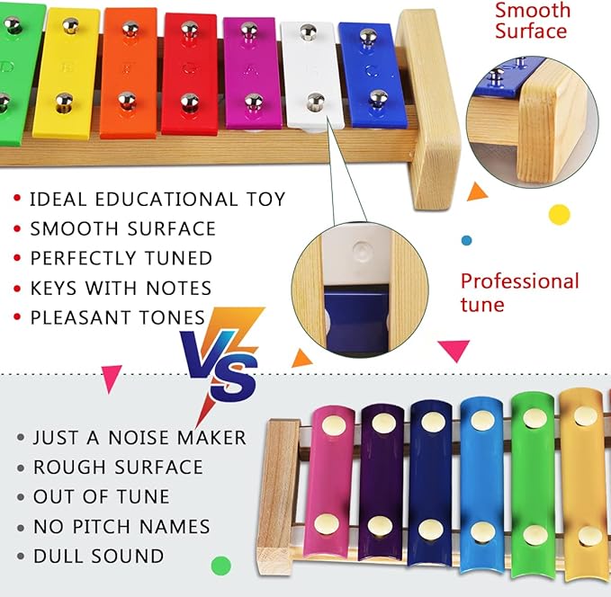 - ✔【Safe and Healthy Musical Toys for Toddlers】:CPC Certification. These instruments are made of high quality environmentally friendly materials, is safe and reliable for young children.With good workmanship, the musical instruments are smooth in surface, round-edge design,nice in polish, and suitable in size. There is no need to worry about injuring when baby play the toys.For younger kids under 3 years old, please be accompanied by adults when playing.