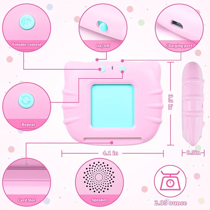 - [Rechargeable & Light ] - The toddler toy comes with built-in rechargeable battery and can be used for up to 4.5 hours, no need to charge frequently. The card reader weights 71g and dimension is 4*3.5*0.5inches, easy for kids to hold. Volume is adjustable. A portable bag is provided for easy storage of the cards and card reader,