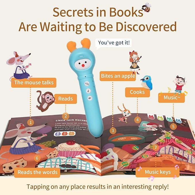 - 【Rich Pre-stored Content】The reading pen for kids has pre-stored with 48 nursery rhymes, 16 stories, and 14 sleeping music, allowing children to listen to music to relax when outside of study, and sooth the baby to sleep.