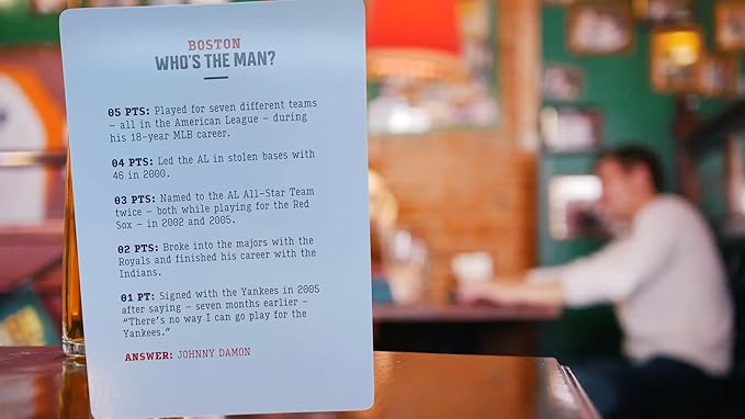 - Players take turns trying to guess the answer (one of the top 100 players from Boston baseball history) from a list of clues read by another player.
