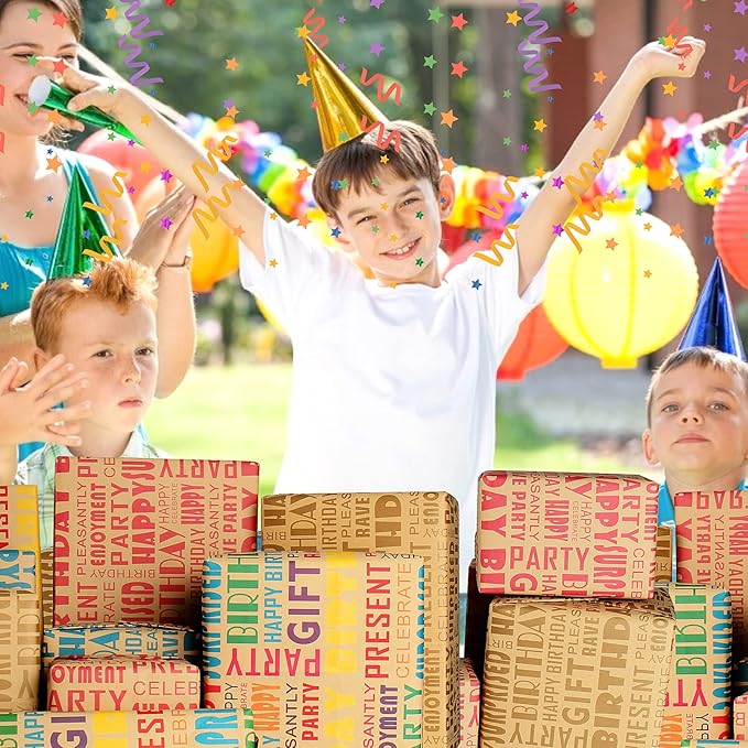 - ๐[Reliable Quality] BSCI FSC approved.The birthday present wrapping paper for gifts is sturdy, well made, and very cute. Made of premium quality kraft paper 100GSM that will ensure you can quickly and efficiently wrap your gifts without worrying about unwanted rips or tears. If some of your favorite brown wrapping paper is the Kraft style and these birthday paper wrapping fit exactly what you love