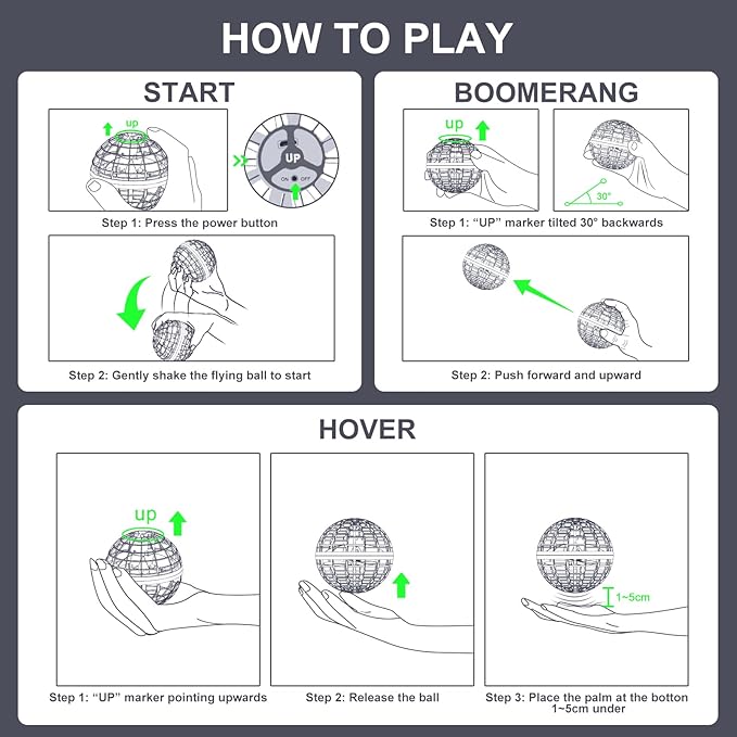 - Super Cool High-Tech Hand Controlled Drone : Our flying orb ball featuring a gyroscope and smart AI chip that promises intelligent flight. Different throwing angles and speeds will create different flight lines and boomerang effect. This cool stuff not only brings fun to play but also helps to improve children's hands-on ability, operating skills, intelligence, and creativity.