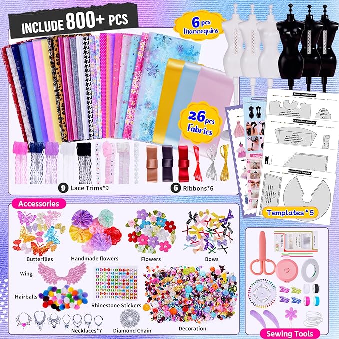 - FULL SET OF TOOLS: More Variety, More Creativity; This fashion design kit includes everything you need, with 800+ pieces of materials to create 85+ unique outfits. The set features 6 dress mannequins, clothing templates, a tape measure, 26 fabric swatches, 6 trims, 6 ribbons, scissors, sewing tools, 100+ decorative flowers and bows, and 400+ other embellishments — perfect for endless creative possibilities!