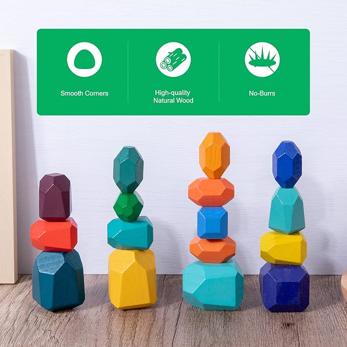 - SAFE MATERIAL:Wooden stacking stones use child-safe water-based paint, which has passed CPC certification. Bright colors not only attract children's interest, but also make kids play better
