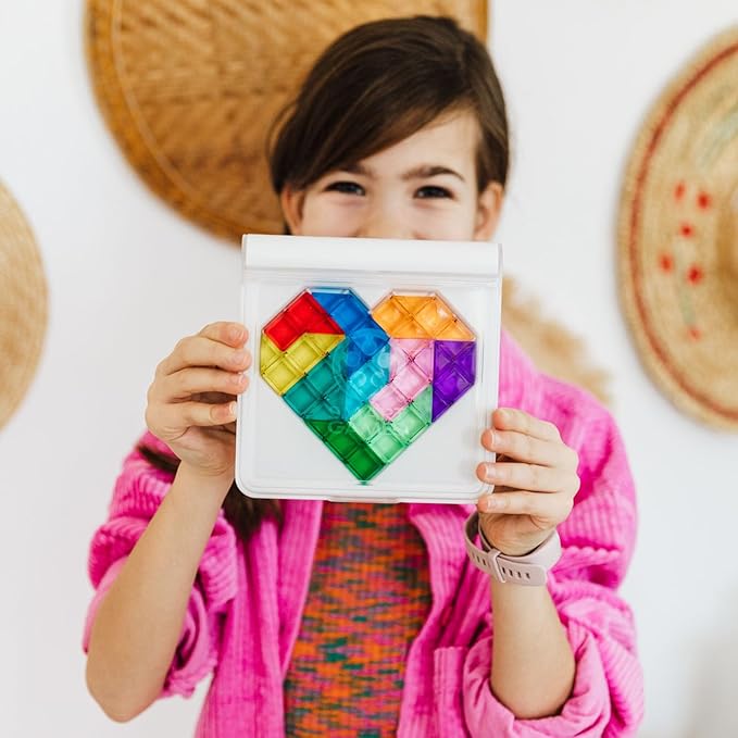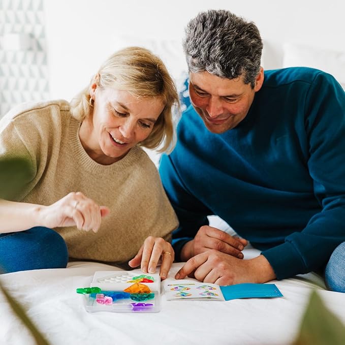 - Set Includes: 1 compact game board with transparent lid, 11 colorful jewel puzzle pieces, and 1 booklet with 120 challenges and solutions.