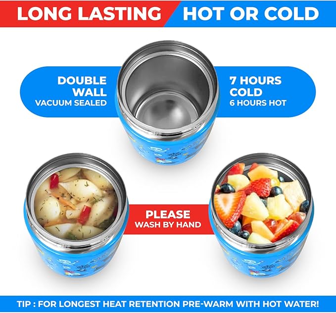 - STAINLESS STEEL FOOD THERMO: Keeps lunch warm (or cool!) for up to 5 hours with this thermal insulated18/8 (SUS304) stainless steel interior with vacuum seal. Super cute and perfect size for young appetites - 10 ounces / 300 ML /1.25 cups. Diameter 3.25"/8.8cm. Height 5"/12.7cm. Non-slip silicone bottom and removable grip band.
