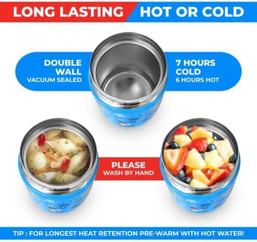 - STAINLESS STEEL FOOD THERMO: Keeps lunch warm (or cool!) for up to 5 hours with this insulated 18/8 (SUS304) stainless steel interior with vacuum seal. Super cute and perfect size for young appetites - 10 ounces / 300 ML /1.25 cups. Diameter 3.25"/8.8cm. Height 5"/12.7cm. Non-slip silicone bottom and removable grip band.