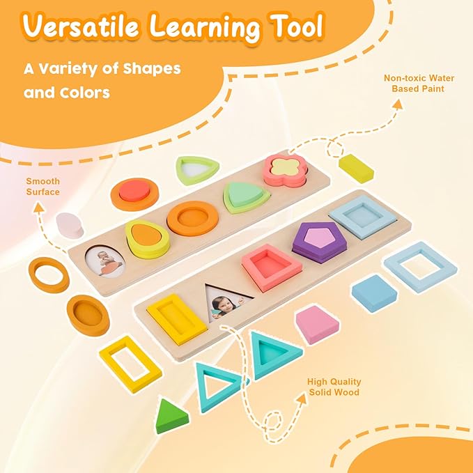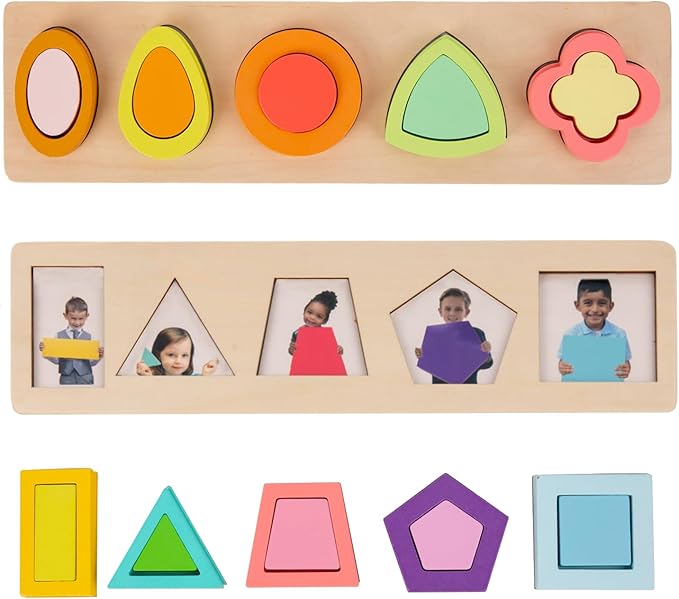 - Geometric puzzle boards for toddlers include red orange yellow green blue purple, each set of 5 different colors a total of 24 shapes with white panels, shape matching cards and colored paper cards. Children can complete the corresponding shape matching through the hints.