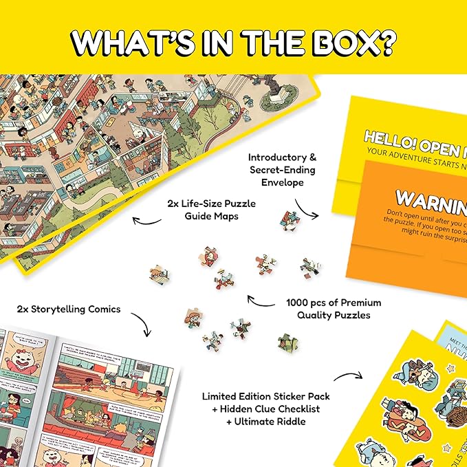- Jigsaw Puzzle with a Twist - The box shows one picture, but the final scene is different! This 1000 piece mystery puzzle reveals hidden jokes, playful surprises, and a story-driven ending as you build.