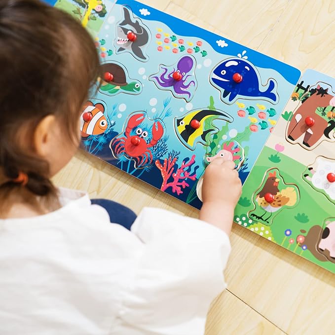 - ANIMALS KNOB PUZZLE: ExploraToy brings you the best wooden puzzles with the cutest illustrations and bright colors, this set includes farm forest animals, pets, and sea ocean animals, designed to be a super fun play-to-learn activity for kids!