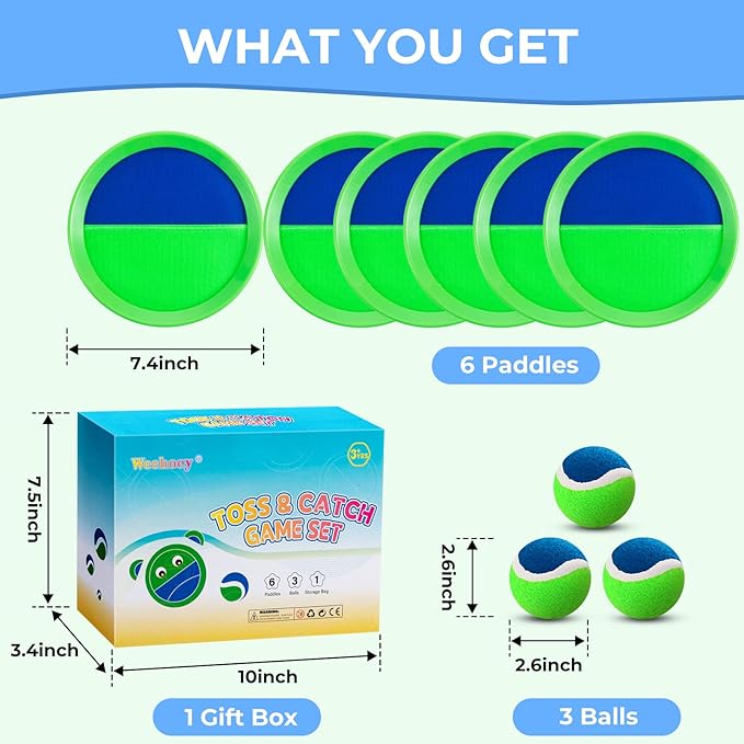 - Ideal Sports & Outdoor Play Toys: Includes 6 paddles, 3 balls,1 portable storage bag and 1 gift box. Both children and parents can play the catch ball game, perfect outdoor games for the family