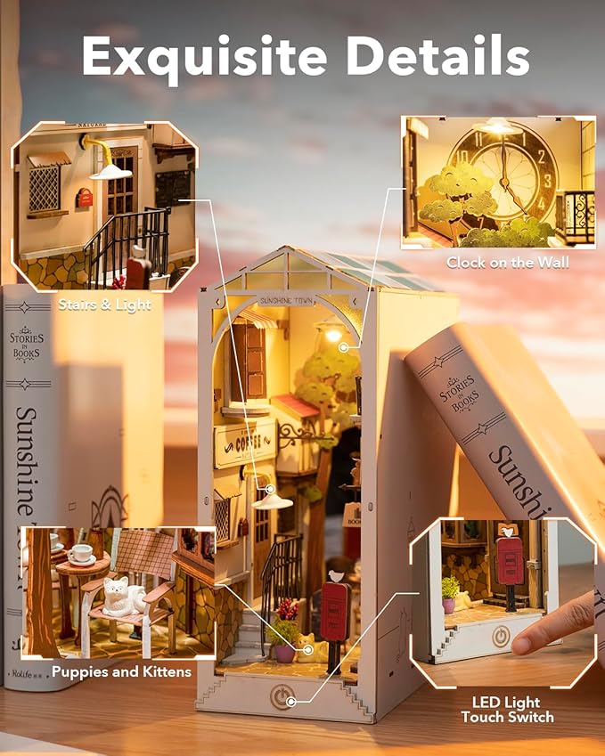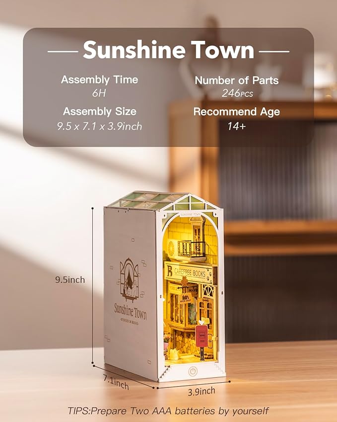 - [ Sunshine Town Bookend Model Building Kit] - The 246-pcs DIY Book Nook Bookshelf Insert Decor Model Building Kit is inspired by the View of the town at dusk, where you feel like been immersed in leisurely time of the town to cherish in the endless dusk. What's more, this is more than just a simple DIY book corner bookend, but also exquisite collectible buildings or bookshelf decorations.