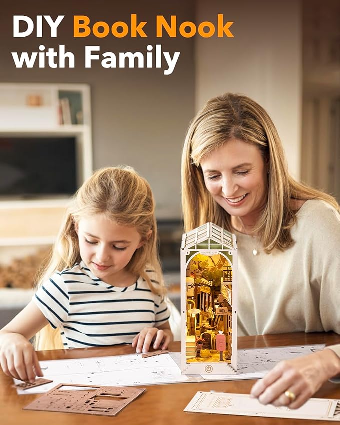 - [ STEM Book Stand Model & Warm Detail ] - Focused on the assembly of this Book Nook DIY Model Kit is absolutely a brilliant way to enhance and develop your Creativity and hands-on ability. Meanwhile, the built-in touch LED light of this book nook kits for adults may bring surprises to you on dark nights, watching these miniaturized landscape decor that you made may warm your heart up and help you relax and release from electronics and hustles.