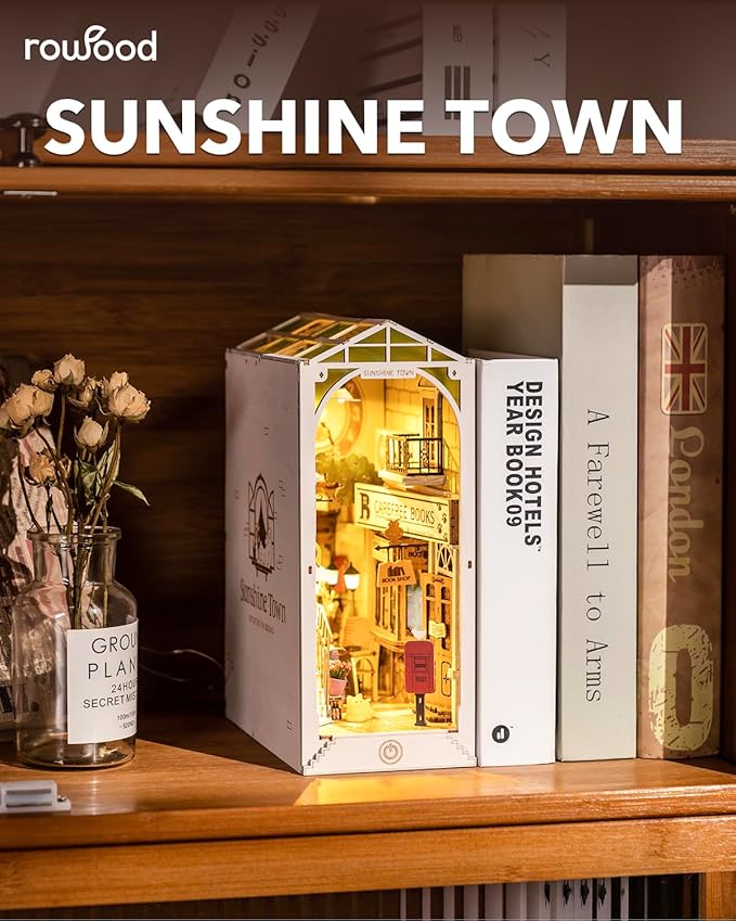 Rowood Book Nook Kits for Adults Bookshelf Insert Decor Alley 3D Wooden Puzzle Bookend DIY Craft Kits for Adults with LED Light - Sunshine Town