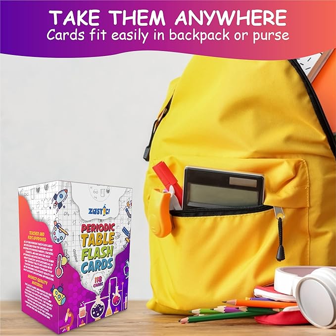 - 118 ELEMENTS – Get kids interested in science with the Zastic! Periodic Table of Elements Flash Cards. You get a set of 118 educational cards that show details about every element on the periodic table. This science flash cards set is the perfect teaching tool for kids.