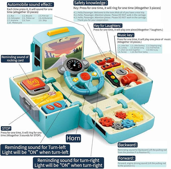 - Simulate real driving: turn the key to start the engine, tap the steering button to emit a realistic steering tone, control the steering wheel to turn left or right, honk the horn to remind others, shift the bus, enjoy accelerating driving and reversing. Kids will love this bus toy to pretend he's driving.