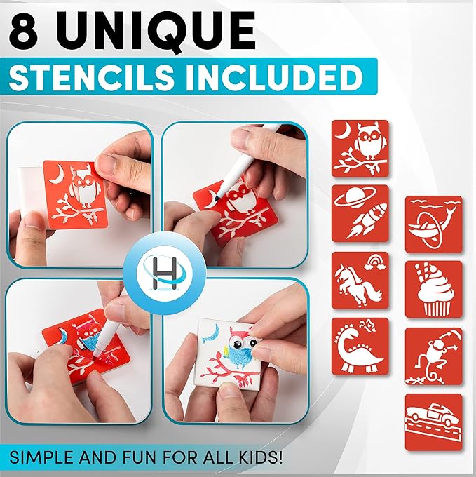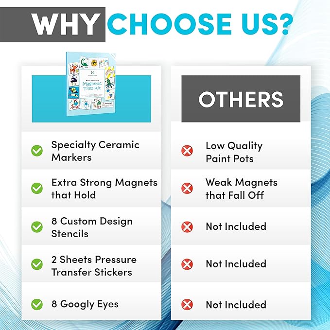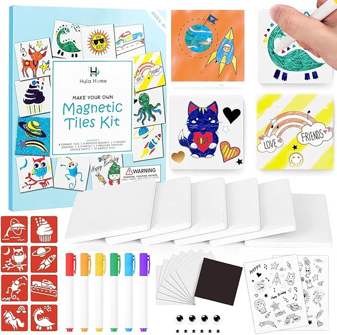 - 【More Decorations Than the Competition! - 109 Crafting Accessories】Our DIY craft kit for kids (8+yrs) includes everything children need to make beautiful magnetic tiles, exactly as pictured: 8 Ceramic Tiles, 8 Adhesive Magnets, 6 Acrylic Markers, 8 Stencils, 77 Water Transfer Stickers and 10 Googly Eye Stickers. Each tile is 2”*2", making them the perfect size for little fingers to decorate! Our kits are great for boys and girls alike and are 100% child safe.