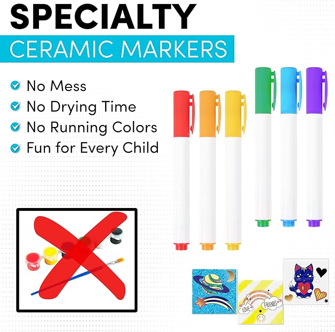 - 【Mess-Free Premium Acrylic Markers】Instead of the difficult to use paint and brush set included by our competitors, our kit goes above and beyond with custom acrylic markers perfectly suited for the ceramic tiles. No more mess, drying times, running colors or otherworldly artistic ability required! Absolutely any child can enjoy decorating these tiles, letting their creativity soar and spending quality time together.