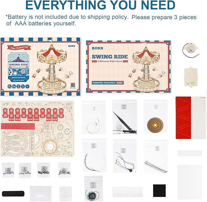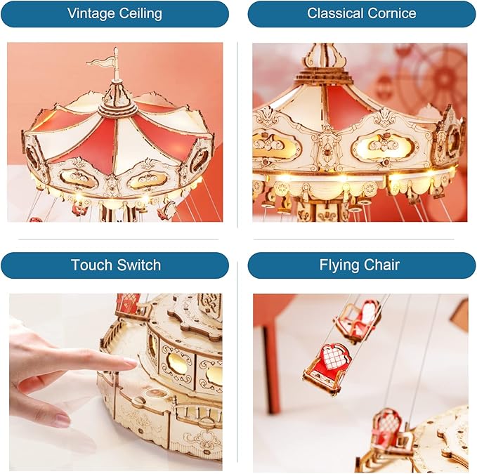 - √SWING RIDE TOY: Build both a realistic swing carousel machine and music box at the same time. The 3d puzzle will swing to the music when you touch its switch. And the romntic lights will fliker like you are in a real amusement park. Melody: "Merry Go Round"