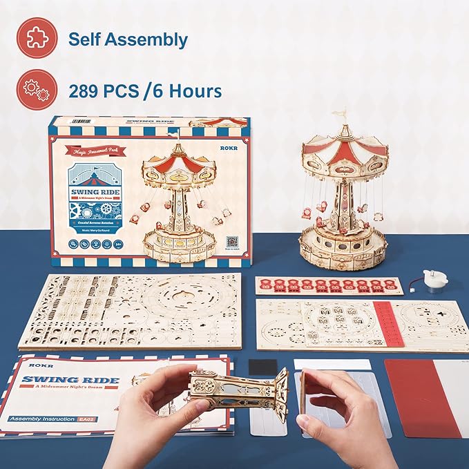 ROKR 3D Puzzles Wooden Music Box Kit with LED, Rotating Swing Ride Mechanical Model Kit DIY Wood Craft Hobbies Kit for Adults Birthday for Adults
