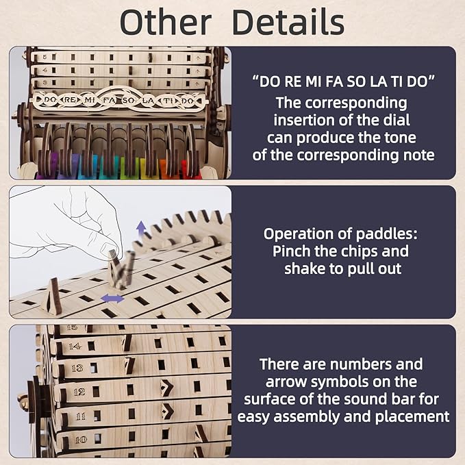 - [Delicate Design】: A combination of hand percussion and jigsaw puzzle. Once the kit is assembled, you can pinch or pull out the chips of the paddles according to the music sheets included or your own idea, then rotating handlethe to play music melody.