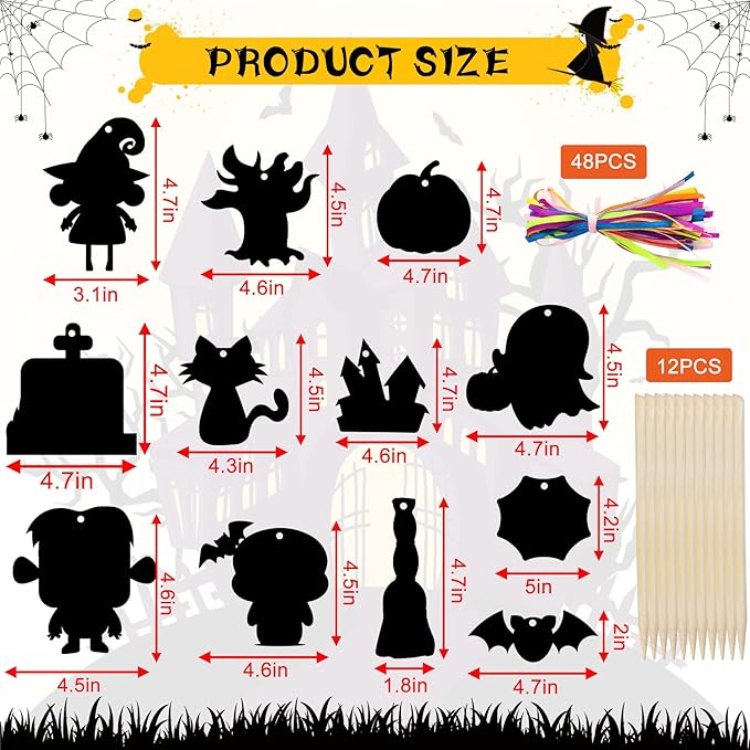 - ๐Scratch Papers Craft Kits: The kit includes 48 Halloween scratch cards (3.2in-5in, 12 different styles ), 12 scratching tools (5.4in) and 48 x colorful ribbons for hanging(8in), which is fun and creative for Halloween party. My product is intended for ages 15 years and older.