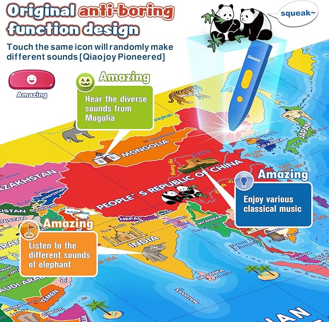 - 【Bilingual World Map & DIY Magic Wand】- Educational talking world map great for children studying in both English and Spanish. The stylus is applicable in all Qiaojoy products; Supporting personalized start-up sound; Supporting recording: kids can use recording function to tell stories, sing songs etc. Imaginatively and interactively design kids own creative world!